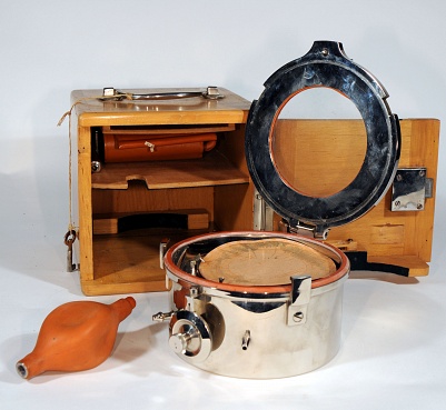 Description: 6“d x 3.25“h steel case has a glass viewer on top with a plate with a pen. The plate holds a circular graph and the revolution and the excursion of the pen are controlled by air pressure from a port. A second port is also present and a dial marked A and Z to open and close the top. The whole is contained in 7” sq pine box, which also contains the cuff and the original instructions.