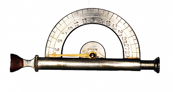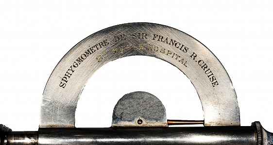 Description: 3 3/4” x 1/4” tube ends with thermoplastic wedge shaped foot and has a barrel inserted in the other end with a circular knob. There is a semi circular gauge 1 1/4” dia with a brass arrow which indicates the extent to which the inside barrel is depressed against a spring 0-29. It is marked Spygomometre de Sir Frances R. Cruise, Saint Mary’s Hospital. With accompanying leather case.