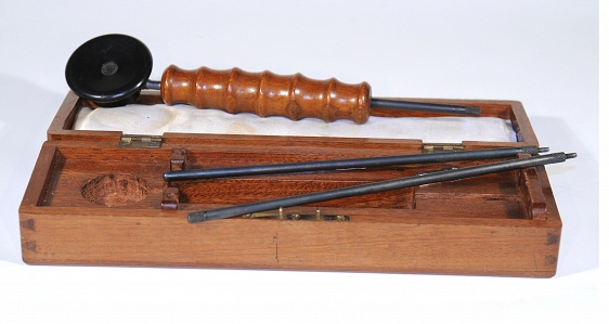 Description: 12.5” x 3.3/4” x 2 1/2” brown oak box with the letters LU on the lid and white silk pad top lid contains three pieces. 10 3/4” main piece has microphone like earpiece 2 3/8” in diameter, wooden turned handle 5 3/4 × 1” and 2 3/4” x 3/16”. There are also tw o extenders that are 3/16” by 9 3/4”, which can be joined to the main piece to extend it. When placed against an object, the sound is nicely transmitted to the earpiece permitting localization. On the earpiece on the back, which is metal and bakelite is inscribed Magnet Arell, 2000 ohms(the symbol) RE.