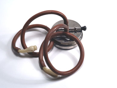 Description: 2.4x.75” diaphragm type scope. The diaphragm has a second attachment with a 2” long rod ending in a gutta percha cover which can be used to localize sound. The tubes are rubber and connect to bone or ivory ear piece.