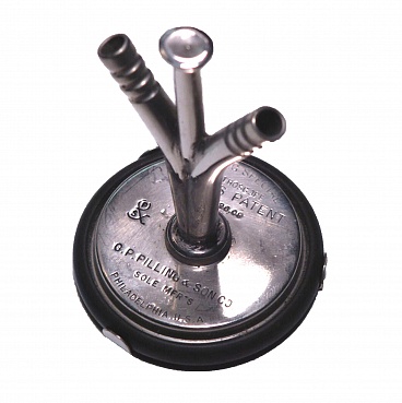 Description: Stethoscope, Pat date 6/25/01. There is a protective metal plate over the Bakelite chest piece, which is 1.75” diameter. Reads this cover to be taken off before using stethoscope. Standard earpiece. This model has a metal connector at right angles to the head, which divides in two and which has an arm in the middle to exert pressure.