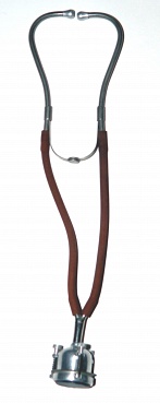 Description: Aluminum or nickle plated stethoscope. The bell is a 1.5×1.5” cylindar which is covered by a leather membrane. There are three screws attached to a .25” rim which holds the membrane and can adjust the tension. The top leads to a 1.5 y tube which connects to 2 rubber tubes and a standard ear piece.