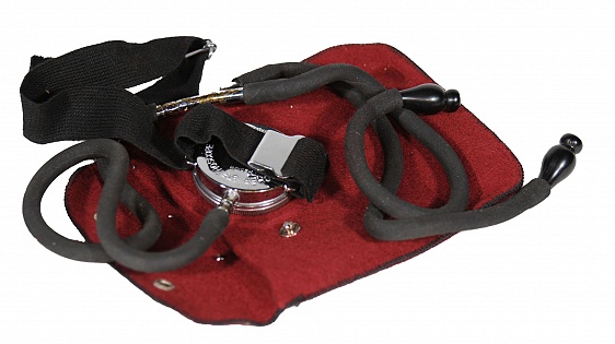 Description: 5“x 4.25“x 1.10” cardboard box contains red felt pouch with 1.5” diaphragm type head with band to attach to the arm. Rubber tubing joined by a steel Y and hard rubber ear pieces. The size is given as medium.