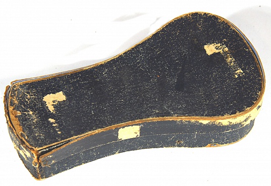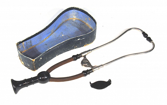 Description: Banjo shaped cardboard box 9” x 5” widest. Lid has label Sharp and Smith, Chicago. Contains a modified Cammann’s. Bell is ebony, 3.5” long in total, 1 3/8” dia. Total length with woven cloth, rubberized tubing 15.5”. The head piece has a circular hinge with a spring and patent date April 1882 and Ford NY and Caswell Hazard on the other side. There is also a 2.5” hard rubber pleximeter. This version is unique because of the internally sprung hinge to apply tension to the ear.