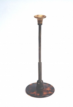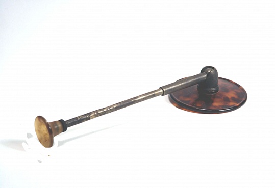 Description: Unusual tortoise shell monaural stethoscope. The ear piece is 2.5” shell and the chest piece also of tortoise 0.75”. The two are connected by a brass rod, the whole 6.25” in length. Unusual is the spring mechanism where if the ear and chest ends are pulled apart, the brass rod unlocks from the ear piece and it can be folded down through a slot for carrying in the pocket.