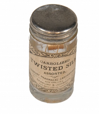 Description: 1.25“x2.75” glass bottle containing three spools of silk thread. Labled Carbolized twisted silk, sorted. Bottle is stamped, Patd Dec 10, 1895. Has a nickle plated screw on cap.