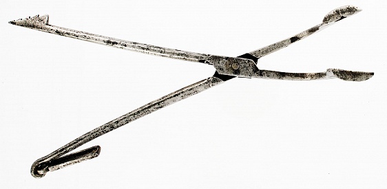 Description: 15” long forged iron forceps with a lock on the handle and a rivet joint. The end is curved and flares to from a ridge on each arm in the characteristic shape of the “cautere a setons” which was used for secondary wound closure. The frequency of infection and the lack of effective therapy led to the use of this approach to wounds. Although it resulted in a major scar, it provided adequate drainage to facilitate healing of infection.