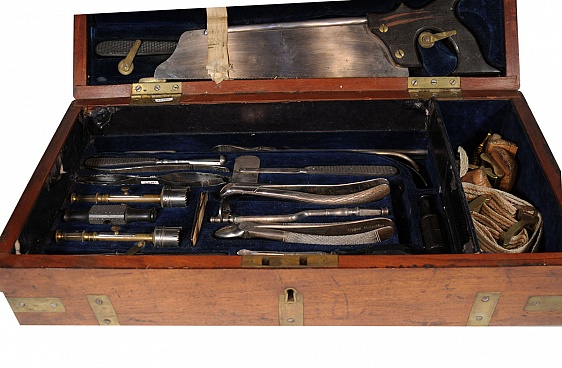 Description: Large general purpose naval or military surgeons chest with 48 assorted instruments for amputation, trephining, dentistry, drainage, extraction of bullets etc. Most with ebony handles. A few replacements, but with this type of set the originals were often from mixed manufacturers. Brass bound mahogany box (cracked). 19.5” x9.75“x 4.75” with original key. Two layers, plus two saws in lid, tourniquets, urologic instruments. Pieces by Weiss, Millikin. It is impossible to know the nature of replacement pieces. In some cases they are original,having been acquired by the owner. Some physicians bought the chest and then filled it or chose instruments from various manufacturers that they preferred. In many instances the pieces are later replacements in an effort to make the chest appear complete. This type of set was meant to be a complete compendium of the type that would be needed on a vessel where limited resources were available or during a military campaign.