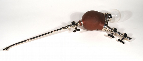 Description: 12“x 6.5“x 4” black box with white metal handle contains 4” d rubber bulb with metal and glass fittings, metal connector tubing with filter, two large 12” metal catheters, funnel and L shaped metal fittings and hardened rubber tubing. Pieces marked Kny Scheerer, Germany. Sounds are 13 also have a right angle connector.