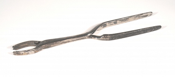 Description: 12” steel forceps with cross hatched handles, the instrument opens around a pivot screw to expand the 2” ridged jaws for grasping and breaking stones in the bladder.