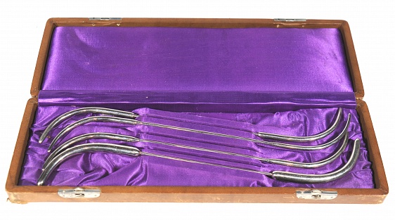 Description: 12.5“x 4.25“x 1.25” leather covered box with purple silk lining contains set of four double ended sounds with silver or nickle plated metal. Thin connection and two sizes on each piece.