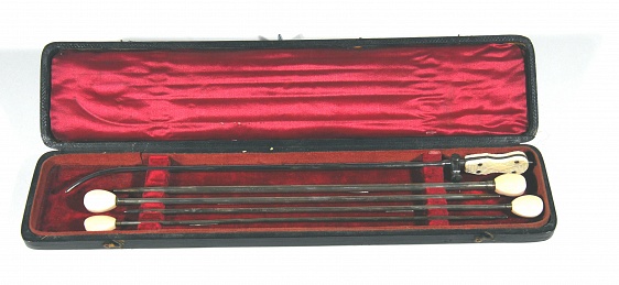 Description: 14.25× 3 1/8 × 7/8” leatherette box with red velvet lining contains 13” hollow sound with ivory checkered handle and 4 11” inserts each with ivory handle and different diameter to expand the sound and dilate the urethra. Handles on dilators are oval flat ivory. There is on the sound to adjust the pressure and there is a wire guide.