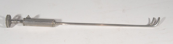 Description: 15.5” steel with 3.5” body and end curve upward for 1” at about 80 degrees with distal lip hollow and internal rod with teeth. The internal rod end in a 1.25” wheel and teeth are advanced by rotating this. Entire sliding inner rod can be locked or released to slide by a wedge shaped lever on body.
