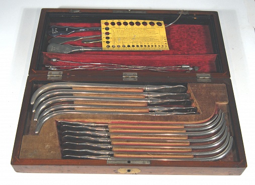 Description: 14.25×6.75×2.75 cherry box with brass escutcheon labeled Tiemann, contains 12 nickle plated assorted sounds all labeled Tiemann in base and assorted dilators in lid with an American Surgical Trade Ass., Sound gauge is cardboard and is shown lying on the lid, it is from Sklar and of a later date. Lid also contains 6 bougies of varied size labeled Wm Hatteroth.