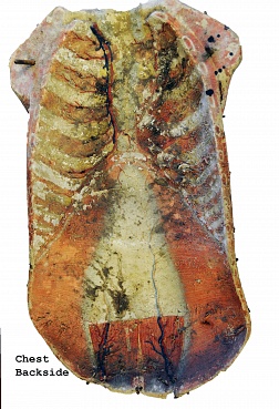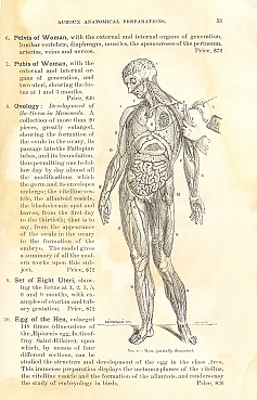 Description: 4’ tall paper mache like anatomic model of a woman. Dissected beneath the skin, chest comes off to reveal individual organs. Faithful anatomic detail, mounted on a metal base with a rod. These anatomic figures were developed by the French Physician Louis Thomas Jerôme Auzoux (1797-1880), . They are described in the Catalogue of Human Skeletons, Anatomical Models (ref 237) from 1862. Another page shows the 5 foot tall man, the female is life size.