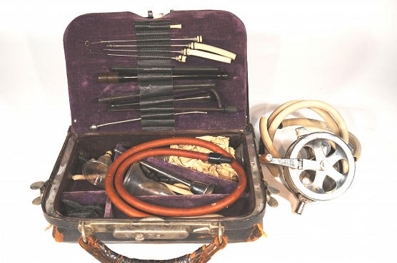 Description: 10“x 6“x 5” black leather bag with chrome plated fitings. Opens to two compartments, one contains a hand cranked cirular pump which compresses a rubber tube (hardened) for pumping action, Pat July 21, 1887. Tubing has thermoplastic fittings. Compartment next to pump contains 4 glass bottles, Carbolic Acid, Merc. Co., Camphor marked Fraser Pharm, Fraser color, Dr. WN Hurst prop and a greenish solidified liquid. Opposite side contains leather covered stomach tube, 4 glass funnels, small cloth sacks, 12 fittings including needles, enema type tubes, etc. Metal uterine cupper (silver or chrome plated), two more funnel shaped cuppers and tubing (aspiration attachments) and a card “ should this pump fail to work at any time write to us stating particulars. Chas. Truax and Co. 75 and 77 Wabash Ave. Chicago, Ill, USA” All this in 5 compartments Attachments are also for syringing and douching as well as transfusion. See page 605 of the reference for more detail.