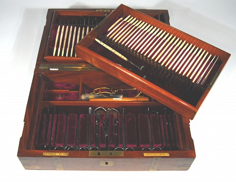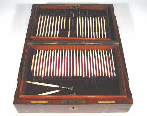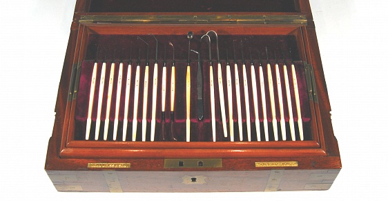 Description: 12 5/8“x 8.25“x 3.25” mahogany case with two wooden lift out drawers in base, red velvet lined. Top tray contains 22 ivory handled ophthalmic tools plus forceps , second tray 33 ivory handled tools, base has sharpener, silver duct probes in wooden case, gold lid retractors, 12 assorted scissors and forceps and suture material, 6 pieces missing. All pieces signed Weiss. The use of ivory made the surgical tools aesthetically appealing but impossible to sterilize. As soon as concepts of sterilization were widely accepted they were replaced by chrome plating or stainless steel. The instruments themselves, are not greatly different in form and use from a modern day surgery.