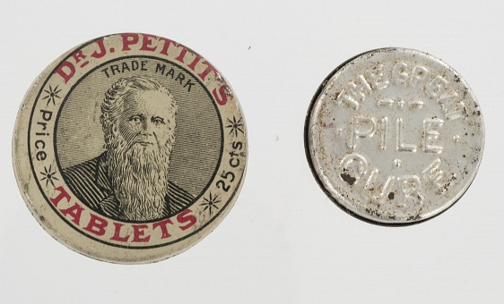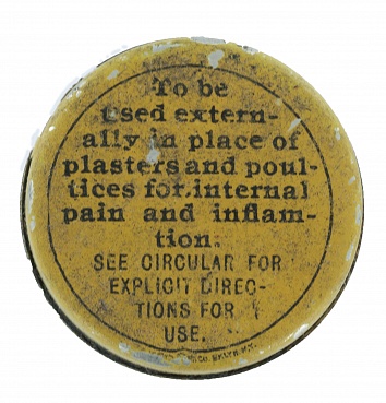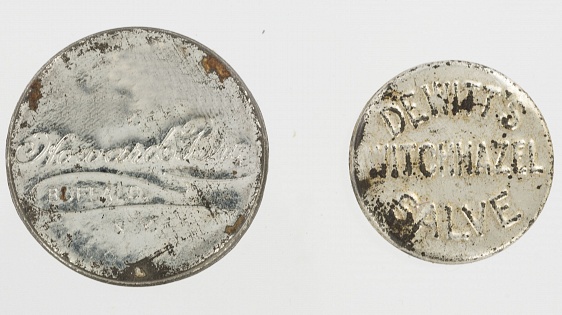 Description: Shown here are three pocket sized medical tin containers. Dr. J Pettit’s Tablets (1 1/4” d), labelled on the back Howard Bros, Buffalo, NY, and Pneumatica, The magic poultice (1 1/4“d), and De Witt’s Witchhazel Salve, labelled on the back: The Great Pile Cure (15/16” d). The manufacturers made several other bottled products, all with similar extravagant claims.