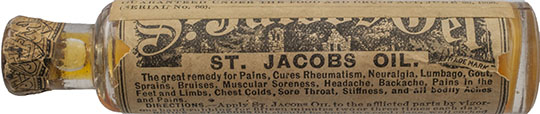 5” x 1“d, cures everything. 10% alcohol and a guarantee to comply with the pure food and drug act of 1906. Changed hands a number of times and was finally sold to Wyeth in the 1920’ and marketed as St Jacob’s Liniment. Early versions were sold as cures.
