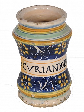Description: 5.5“x 3.75” earthenware pot decorated in a deep blue with oraange floral design. Waisted and a clear white area with the label. Modeled after a type made in Tuscany. Labeled Cvriandoli para. Has green around rim as well.