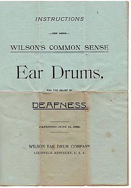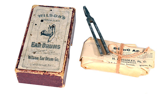 Description: 4.25” x 2.25” x 1” box with label as above which also says comfortable, invisible with an illustration on the front of an ear in cross section. Box contains a tuning fork, a probe and a package of Boric acid prepared by H. Hadley, Wayne, PA. The instructions in the box show the probe with cotton to clean the ears and a forceps inserting the drums, which are now gone. Claims relief of deafness.