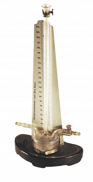 Description: 11.5” tube including 1” reservoir with an inlet tube from pump and an outlet tube to cuff. Iron base, oval, 6“x 2.5“x. 0.75” serving as a firm support. There is a triangular metal plate behind the tube, which has the mm scale and which is adjustable in height. 10” long, 3” at widest, 1.5” at narrowest. This is the more common commercial model of this very early blood pressure device.