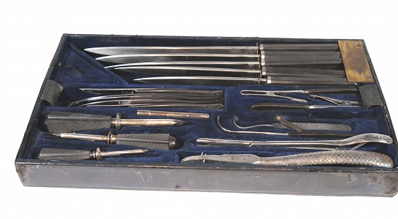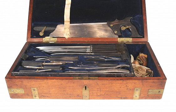 Description: Large general purpose naval or military surgeons chest with 48 assorted instruments for amputation, trephining, dentistry, drainage, extraction of bullets etc. Most with ebony handles. A few replacements, but with this type of set the originals were often from mixed manufacturers. Brass bound mahogany box (cracked). 19.5” x9.75“x 4.75” with original key. Two layers, plus two saws in lid, tourniquets, urologic instruments. Pieces by Weiss, Millikin. It is impossible to know the nature of replacement pieces. In some cases they are original,having been acquired by the owner. Some physicians bought the chest and then filled it or chose instruments from various manufacturers that they preferred. In many instances the pieces are later replacements in an effort to make the chest appear complete. This type of set was meant to be a complete compendium of the type that would be needed on a vessel where limited resources were available or during a military campaign.