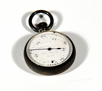 Description: 1’ diameter pocket watch like arrangement. Silver case. Labeled Immischs Thermometer, pat Jan 3, 1882 serial #16191 with a fahrenheit scale from 70 to 111 and a centrigrade scale which corresponds. Calibrated in 1/2 degrees to 90 then in 2/10 for F scale. Needle is zeroed by pulling or pushing the fob. Records temperature on contact.